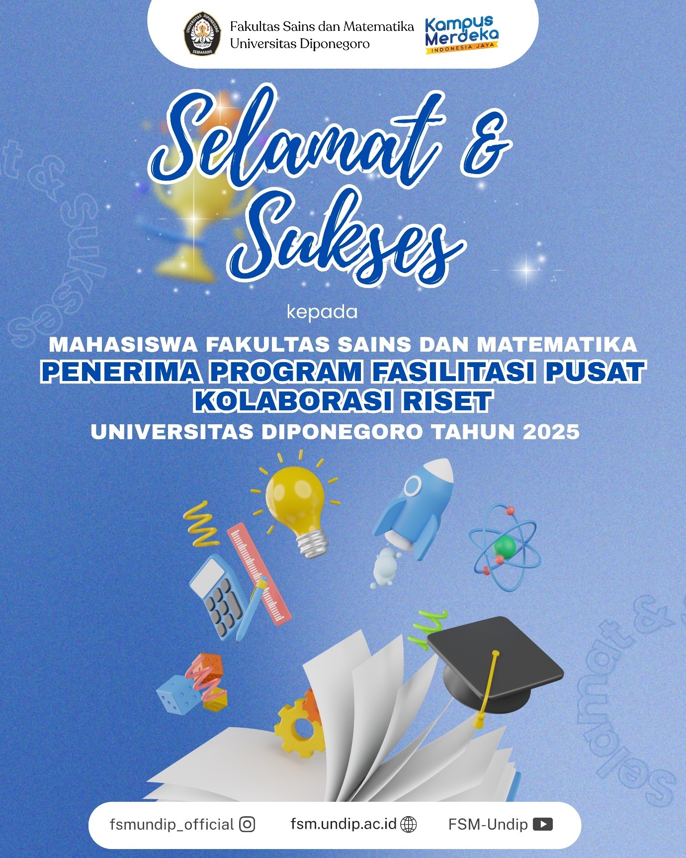 Fakultas Sains dan Matematika Universitas Diponegoro (FSM UNDIP) kembali menorehkan prestasi membanggakan di bidang riset dan pengabdian. Sebanyak puluhan dosen FSM berhasil meraih pendanaan dalam Program Penelitian dan Pengabdian kepada Masyarakat Tahun Anggaran 2025 yang diselenggarakan oleh Direktorat Penelitian dan Pengabdian kepada Masyarakat (DPPM), Kementerian Pendidikan Tinggi, Sains, dan Teknologi.
