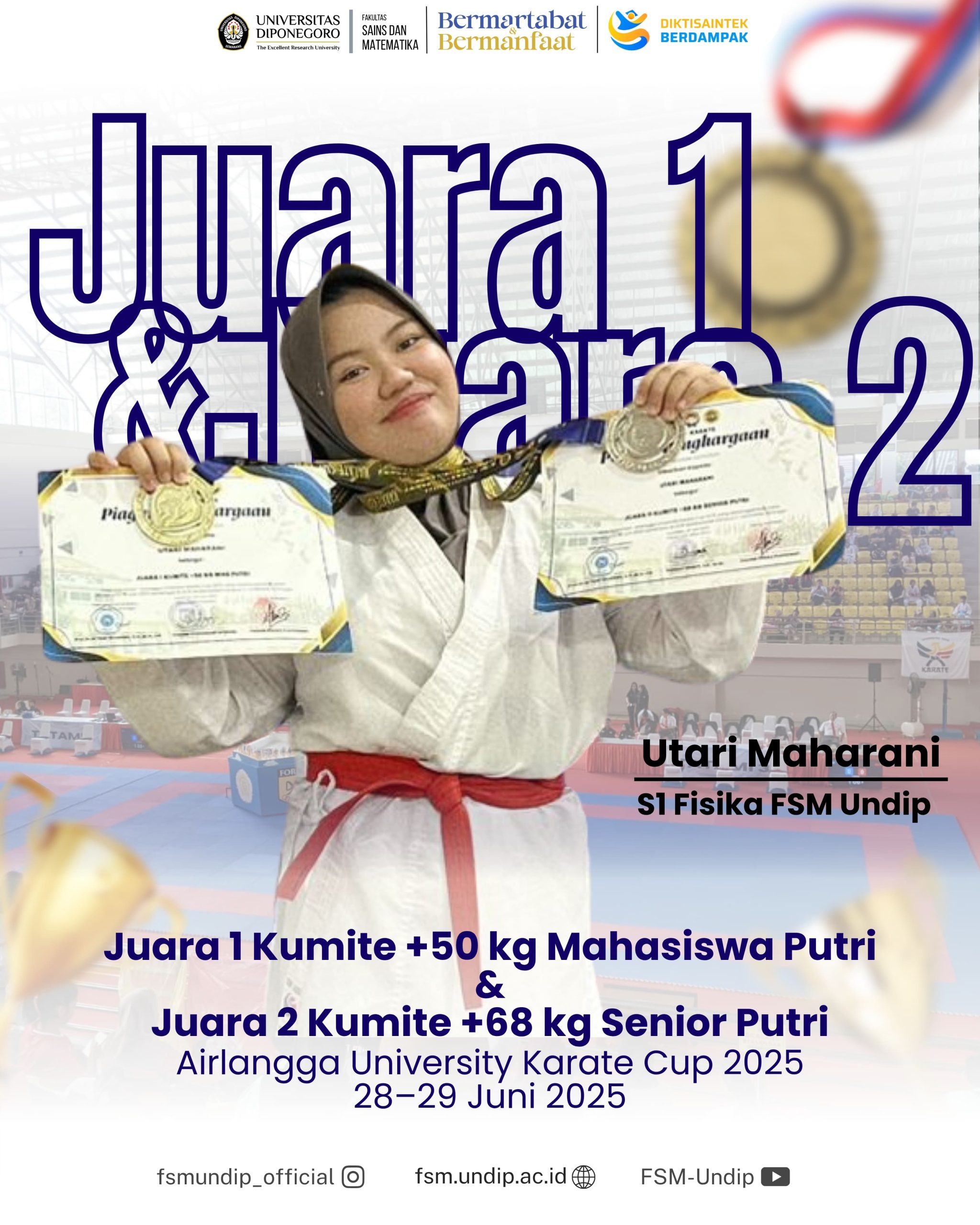 Mahasiswa Fakultas Sains dan Matematika Universitas Diponegoro (FSM UNDIP) kembali menorehkan prestasi membanggakan dalam kejuaraan nasional. Utari Maharani, mahasiswa Program Studi Fisika, berhasil meraih dua gelar juara pada ajang Airlangga University Karate Cup 2025 yang digelar di GOR Kampus C Universitas Airlangga, Surabaya pada 28-29 Juni 2025.