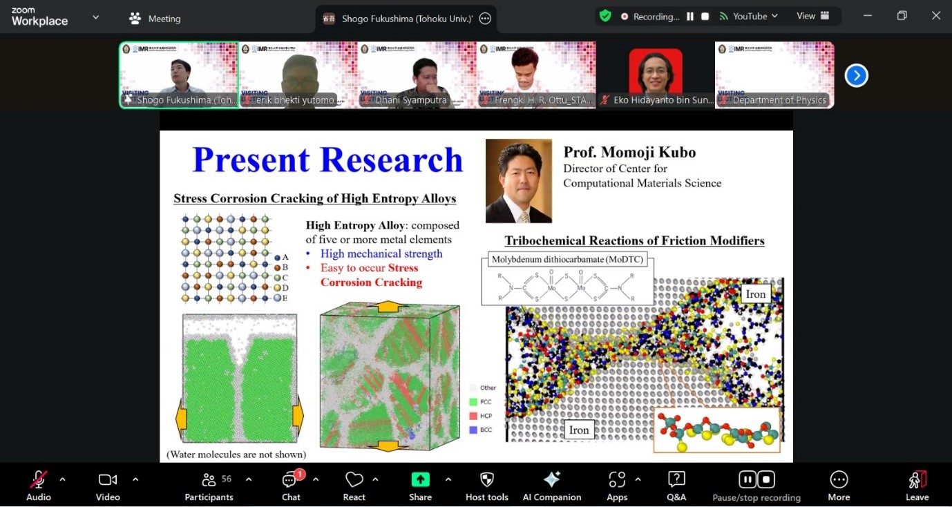 Departemen Fisika, Fakultas Sains dan Matematika Universitas Diponegoro menyelenggarakan Visiting Professor secara daring dengan narasumber Assist. Prof. Shogo Fukushima, Ph.D., dari Institute for Materials Research, Tohoku University. Kegiatan bertaraf internasional ini berlangsung pada Rabu, 24 September 2025 dan dibuka resmi oleh perwakilan Departemen Fisika, Prof. Dr. Eng. Eko Hidayanto, S.Si., M.Si., F.Med.