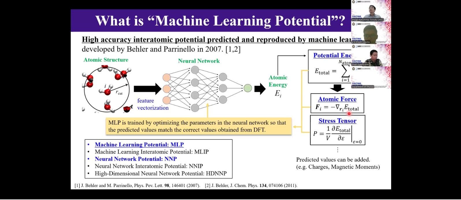 Mengusung tema “Machine Learning Potentials and its Application for Materials Science,” Assist. Prof. Fukushima memaparkan konsep Machine Learning Potential (MLP) sebagai metode komputasi berbasis kecerdasan buatan untuk merepresentasikan interaksi atom secara efisien. Pendekatan ini memungkinkan perhitungan berkecepatan tinggi tanpa mengorbankan ketelitian hasil.