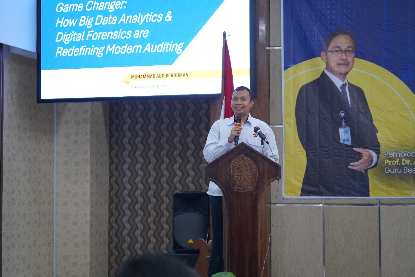 Pembicara kedua, Muh. Abdur Rohman, S.Kom., M.Cybersec., CFE., CHFI (Koordinator Teknis Laboratorium Forensik Digital BPK RI yang juga Direktur Eksekutif AAFI), menyoroti pergeseran audit menuju analitik data skala besar dan pembuktian digital. Ia memaparkan bagaimana tren mobile, cloud, crypto, hingga AI menuntut kompetensi forensik digital untuk mengekstraksi dan memverifikasi bukti elektronik secara sahih. Penerapan perangkat analitik yang tepat disebut mampu meningkatkan akurasi, mempercepat proses pemeriksaan, dan memperkuat akuntabilitas sektor publik maupun korporasi, dengan etika, kolaborasi, dan keahlian lintas disiplin sebagai prasyarat utama.