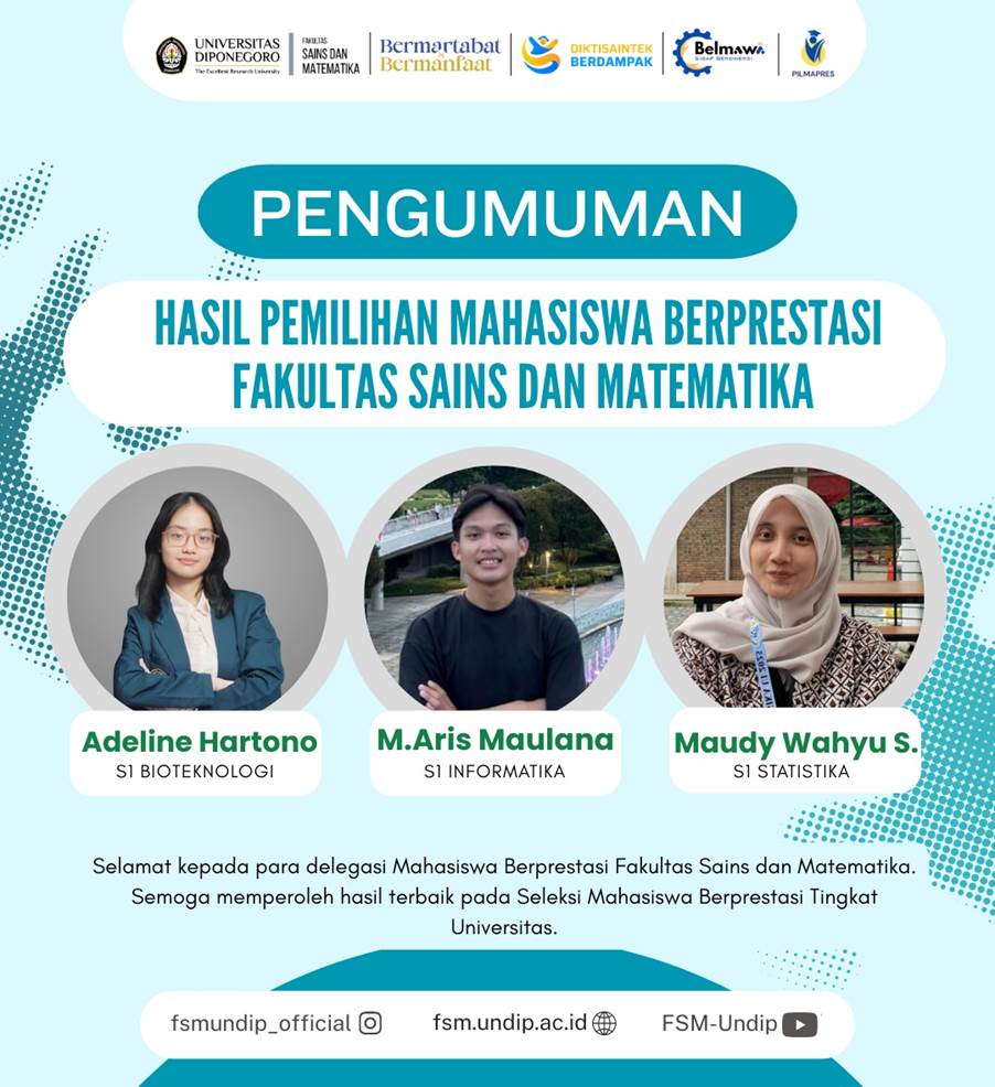 Melalui kegiatan ini, FSM UNDIP berharap mahasiswa terpilih dapat terus mengembangkan potensi, memperluas dampak karya, serta membawa nama baik fakultas di kancah universitas hingga nasional. Semangat berprestasi yang ditunjukkan dalam ajang ini diharapkan menjadi inspirasi bagi seluruh mahasiswa FSM UNDIP untuk terus berkarya, berinovasi, dan berkontribusi nyata bagi masyarakat dan