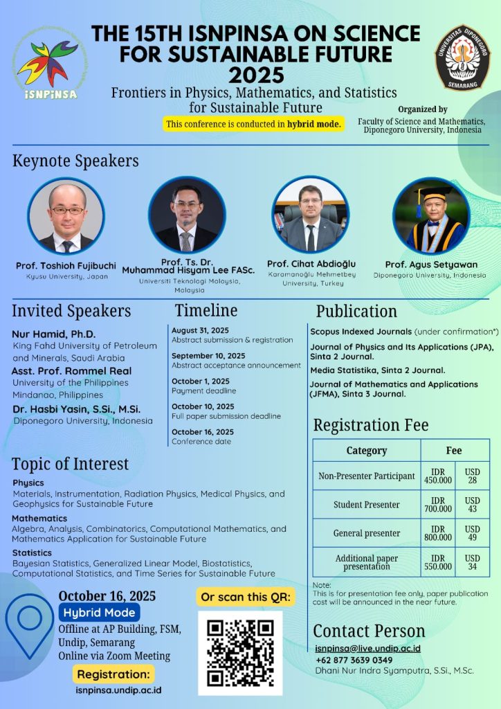 Fakultas Sains dan Matematika Universitas Diponegoro (FSM UNDIP) kembali menyelenggarakan konferensi internasional bergengsi, The 15ᵗʰ International Seminar on New Paradigm and Innovation on Natural Sciences and Its Application (ISNPINSA) 2025, yang akan berlangsung pada 16 Oktober 2025 secara hybrid, bertempat di Gedung Acintya Prasada FSM UNDIP, Semarang dan secara daring melalui Zoom. Mengusung tema “Frontiers […]
