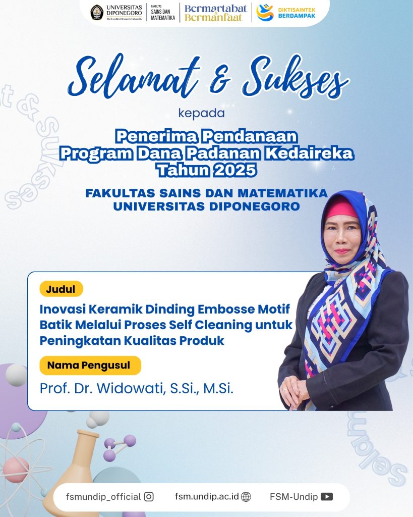 Fakultas Sains dan Matematika Universitas Diponegoro (FSM UNDIP) kembali menorehkan prestasi di tingkat nasional. Salah satu dosen dari FSM UNDIP berhasil lolos sebagai penerima pendanaan Program Dana Padanan (Matching Fund) Kedaireka Tahun 2025 yang diselenggarakan oleh Kemendikbudristek. Program Dana Padanan Kedaireka merupakan salah satu upaya pemerintah untuk menjembatani sinergi antara Perguruan Tinggi dan Dunia Usaha […]