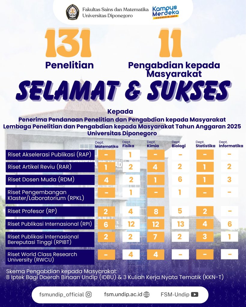 Fakultas Sains dan Matematika (FSM) Universitas Diponegoro dengan bangga mengucapkan selamat dan sukses kepada penerima pendanaan penelitian dan pengabdian kepada masyarakat untuk tahun anggaran 2025. Program ini bertujuan untuk mendorong inovasi dan pengembangan ilmu pengetahuan yang berdampak positif bagi masyarakat. Sebagai tindak lanjut dari penawaran penerimaan proposal penelitian dan pengabdian yang bersumber dari dana Selain […]