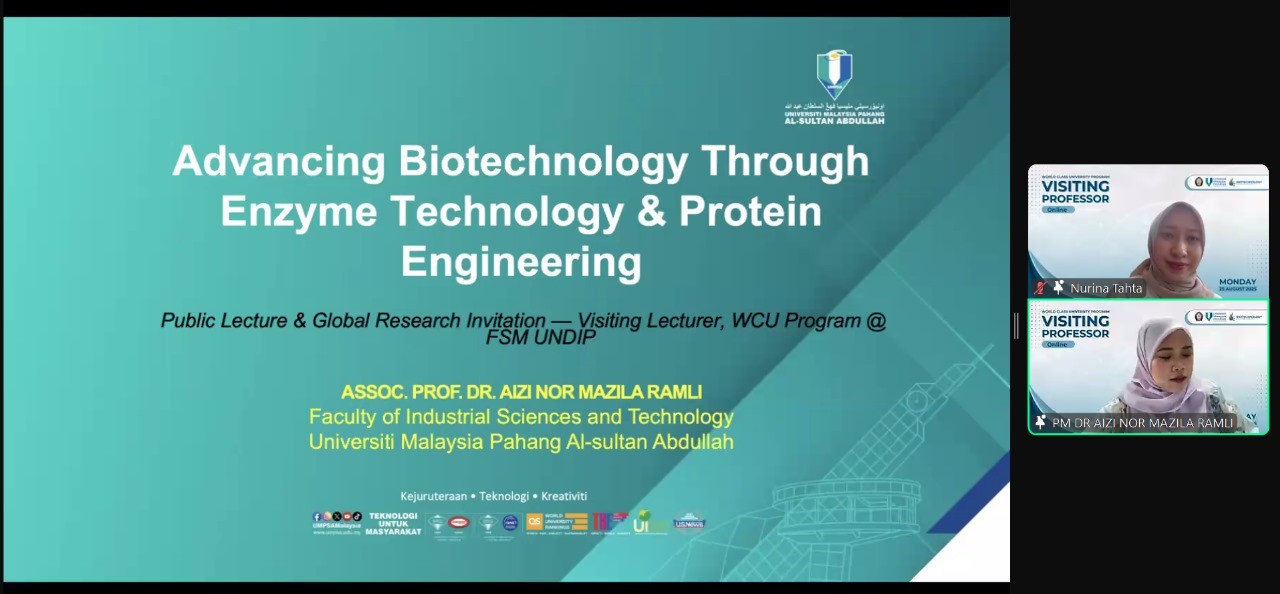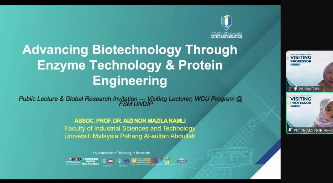 The Biotechnology Study Program, Faculty of Science and Mathematics, Universitas Diponegoro (UNDIP) successfully held an online Visiting Professor event via Zoom on August 25, 2025. This event was part of the World Class University Program and featured Assoc. Prof. Dr. Aizi Nor Mazila Ramli, Dean of the Faculty of Industrial Sciences and Technology at Universiti Malaysia Pahang, Al-Sultan Abdullah.