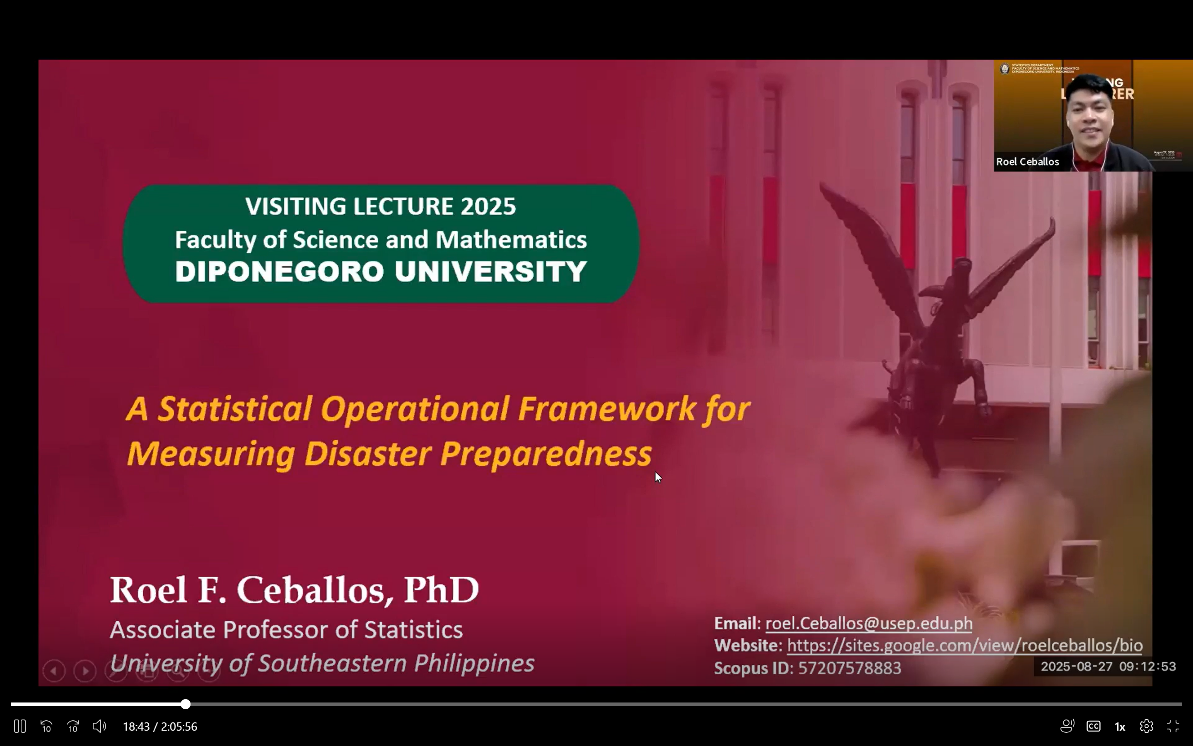 The Department of Statistics at the Faculty of Science and Mathematics (FSM) of Universitas Diponegoro (UNDIP) hosted an Online Visiting Professor titled “Statistical Operational Framework for Measuring Disaster Preparedness” on Wednesday, August 27, 2025. This event took place virtually through Zoom, with Dr. Roel F. Ceballos from the Department of Mathematics and Statistics, University of Southeastern Philippines (USeP), Philippines, as the main speaker. The visiting professor was moderated by Alan Prahutama, S.Si, M.Si, Ph.D., a Statistics lecturer at FSM UNDIP.