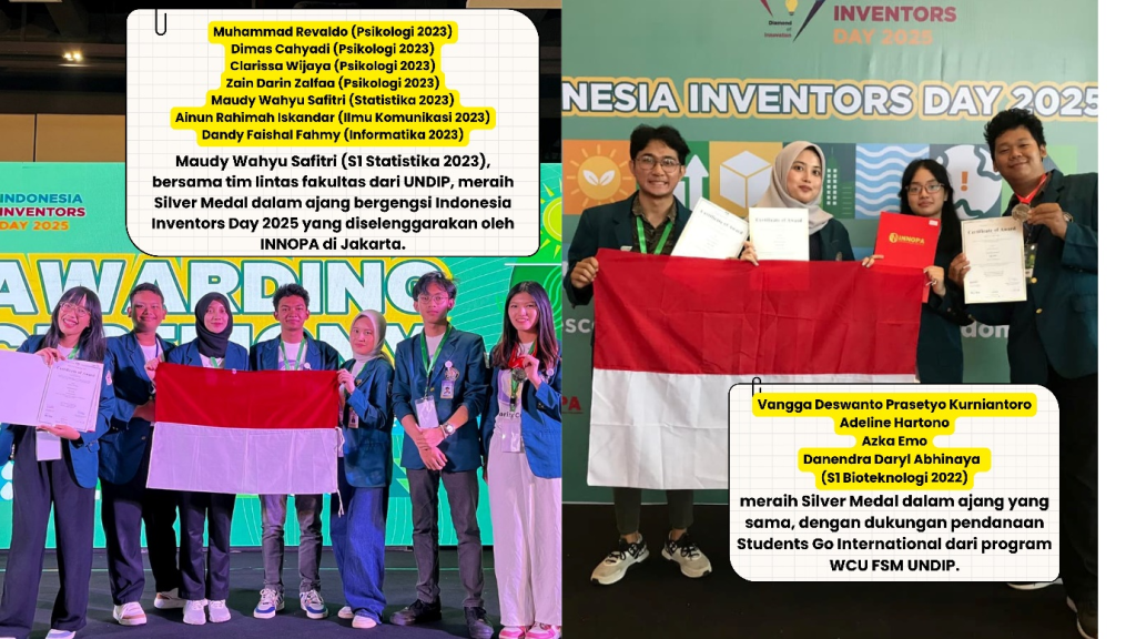 - Vangga Deswanto Prasetyo Kurniantoro (Undergraduate in Biotechnology, Class of 2022) and his team also earned a Silver Medal at the same event, supported by the Students Go International program funded under FSM UNDIP’s WCU initiative.