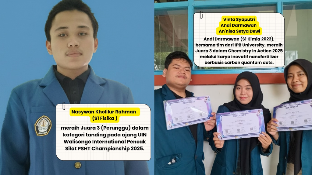 - Nasywan Kholilur Rahman (Undergraduate in Physics, Class of 2025) won 3rd Place (Bronze Medal) in the sparring category at the UIN Walisongo International Pencak Silat PSHT Championship 2025.