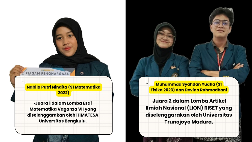 - Muhammad Syahdan Yudha (Undergraduate in Physics, Class of 2023) and Devina Rahmadhani won 2nd Place in the National Scientific Article Competition (LION RISET) hosted by Trunojoyo University of Madura.