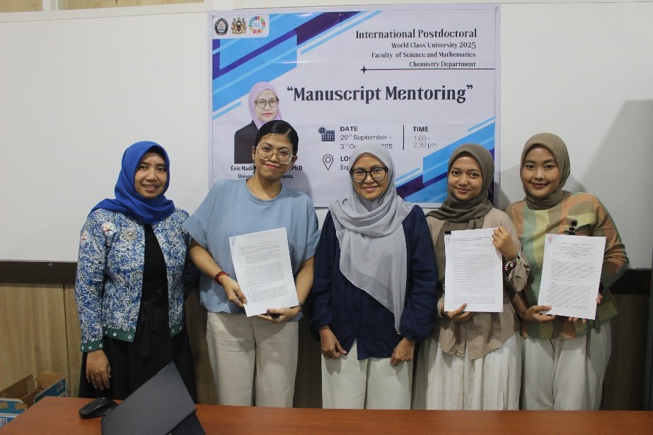 Semarang, October 3, 2025 — The Department of Chemistry, Faculty of Science and Mathematics (FSM), Diponegoro University held a “Manuscript Mentoring” program as part of the International Postdoctoral Program series. The activity ran from September 29 to October 3, 2025 on the 2nd floor of the Acintya Prasada Building, FSM, every day from 13:00 to 14:30 WIB, featuring Dr. Enis Nadia binti Md Yusof, Ph.D. (Chemical Science Program, School of Distance Education, Universiti Sains Malaysia) as the lead mentor.