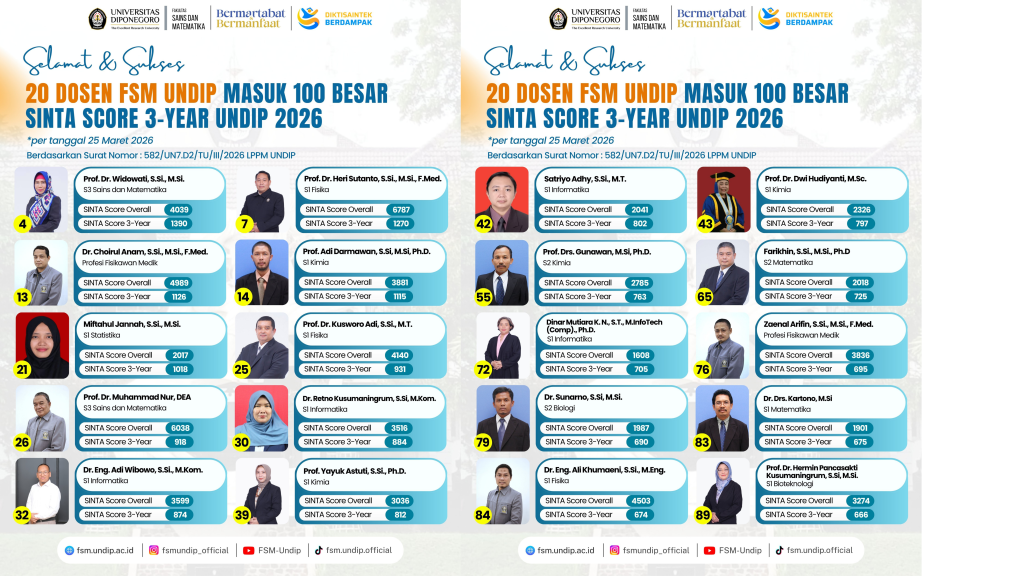 The Faculty of Science and Mathematics at Diponegoro University (FSM UNDIP) has once again demonstrated significant achievements in academics and research. Based on data released by the Institute for Research and Community Services (LPPM) UNDIP, a total of 20 FSM UNDIP lecturers have been ranked among the top 100 of the SINTA Score 3-Year at […]