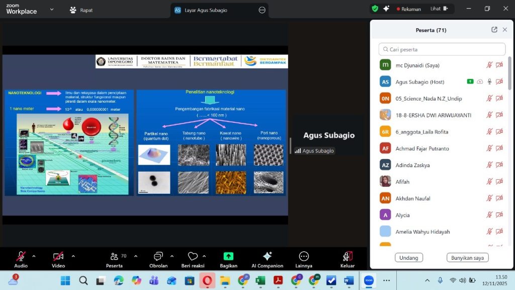 Semarang, 12 November 2025 – The Doctoral Program in Science and Mathematics (DSM), Faculty of Science and Mathematics, Diponegoro University held a webinar entitled “Nanotechnology for Indonesia.” This research sharing session presented Prof. Dr. Agus Subagio, S.Si, M.Si (Professor of the DSM Program) as speaker, with Prof. Dr. M. Cholid Djunaidi, M.Si, S.Si (Professor of […]